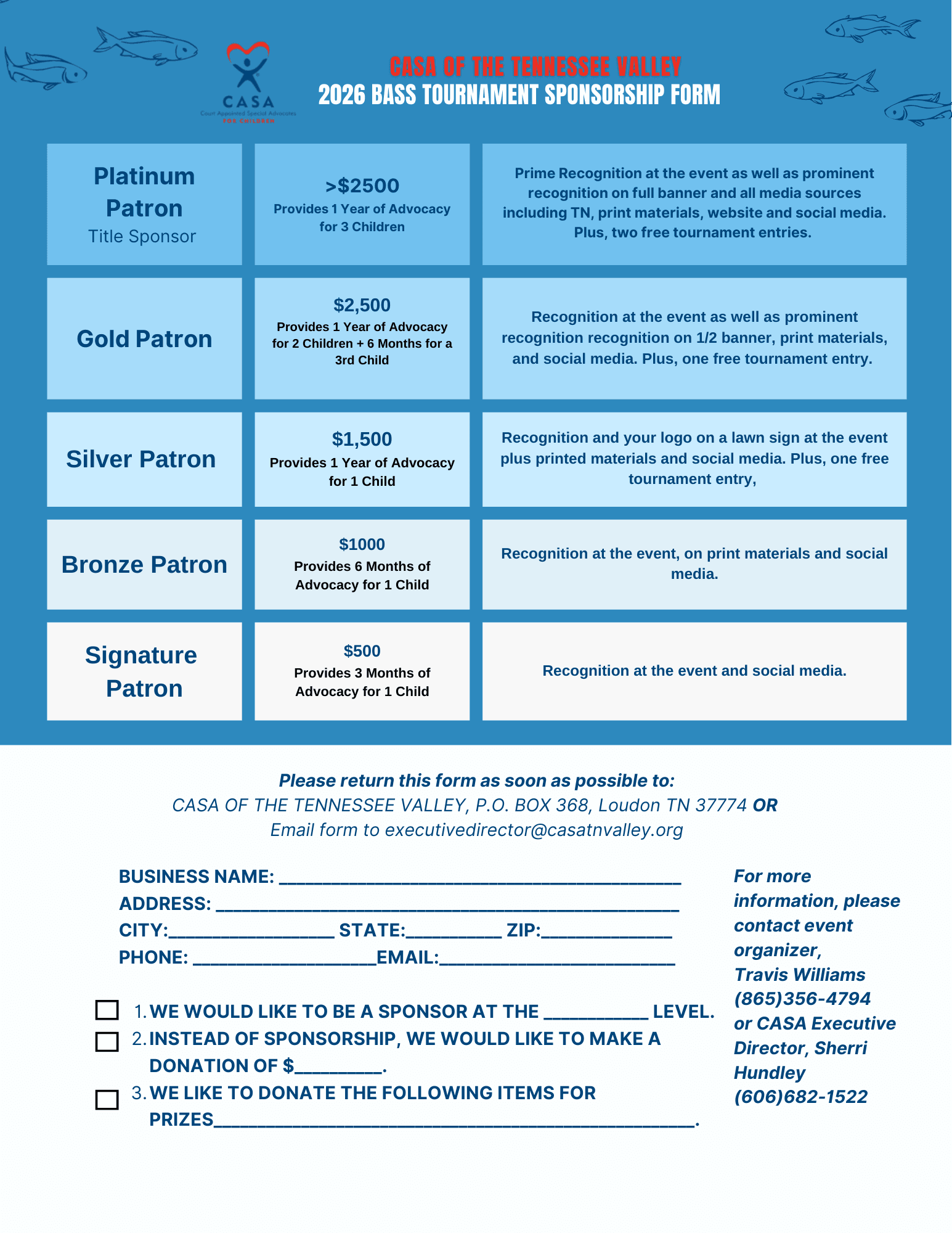 We offer several sponsorship levels (see below). You may also select “Other” and enter the amount you wish to sponsor. If you prefer, you can email your completed sponsorship application to executivedirector@casatnvalley.org and mail a check to: